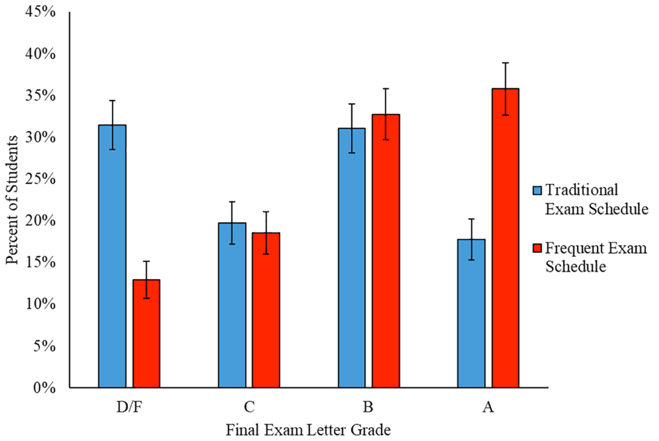 How much did student learning improve? Students using the frequent exam schedule scored 7% higher on average (about 2/3 of a letter grade) on the final exam. This resulted in twice the number of A grades on the final and a drop of 60% in D and F grades (see Figure 2). The improvement was actually higher on the free-response questions (+11.3 percentage points) than the multiple-choice questions (+3.5 points), despite the fact that students had not practiced pen-and-paper free-response questions before in this class. There were over 200 students in each of the traditional- and frequent-exam semesters so all the results are statistically significant. As detailed in the paper, women and minority students had the same increases as the rest of the population.