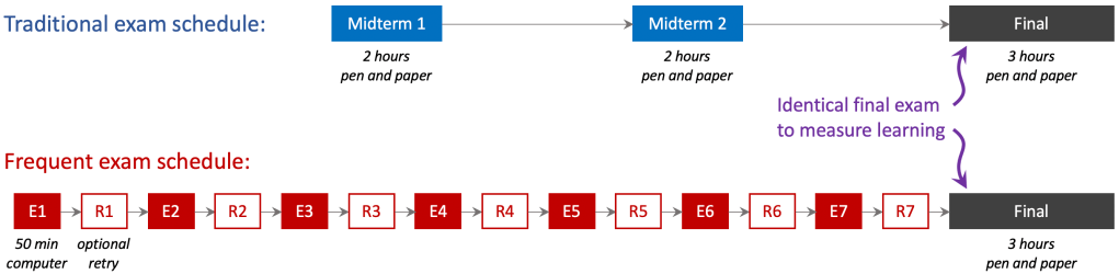 How was learning measured? Two semesters were compared, one using the traditional exam schedule and the other using frequent exams. Both semesters finished with an identical pen-and-paper final exam that consisted of 13 multiple-choice questions and three free-response questions in the given–find–solution format. In each semester all students took the exam at the same time in a proctored facility and the exam papers were kept secret and never released to students. The exam was hand-graded using an identical detailed rubric in each semester. The statistical analysis controlled for the ability of the incoming student population using grades in the prerequisite course.