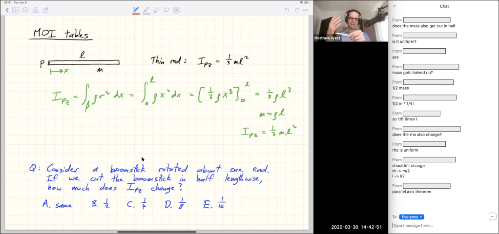 Using chat like this is actually better for interaction than teaching in person in a large lecture theater. In-person questions or comments are very slow, requiring the whole raise-hand/call-on-student/ask-question cycle. It’s so much faster for me to see a question go by in chat and just immediately react to it. Many times, simple questions are answered by other students and I choose to let them go past without comment. I’m so happy with this new format that I will be exploring ways of using chat during in-person lectures, once we are back on campus.